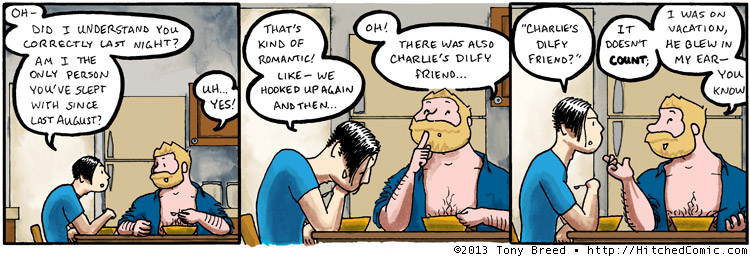 I try to keep it so that continuity doesn’t matter too much for this comic—it’s there, but you can jump in at any time—but here are some references: Last August, when Ken and Corey hooked up again: It starts with[…]↓ Read the rest of this entry…